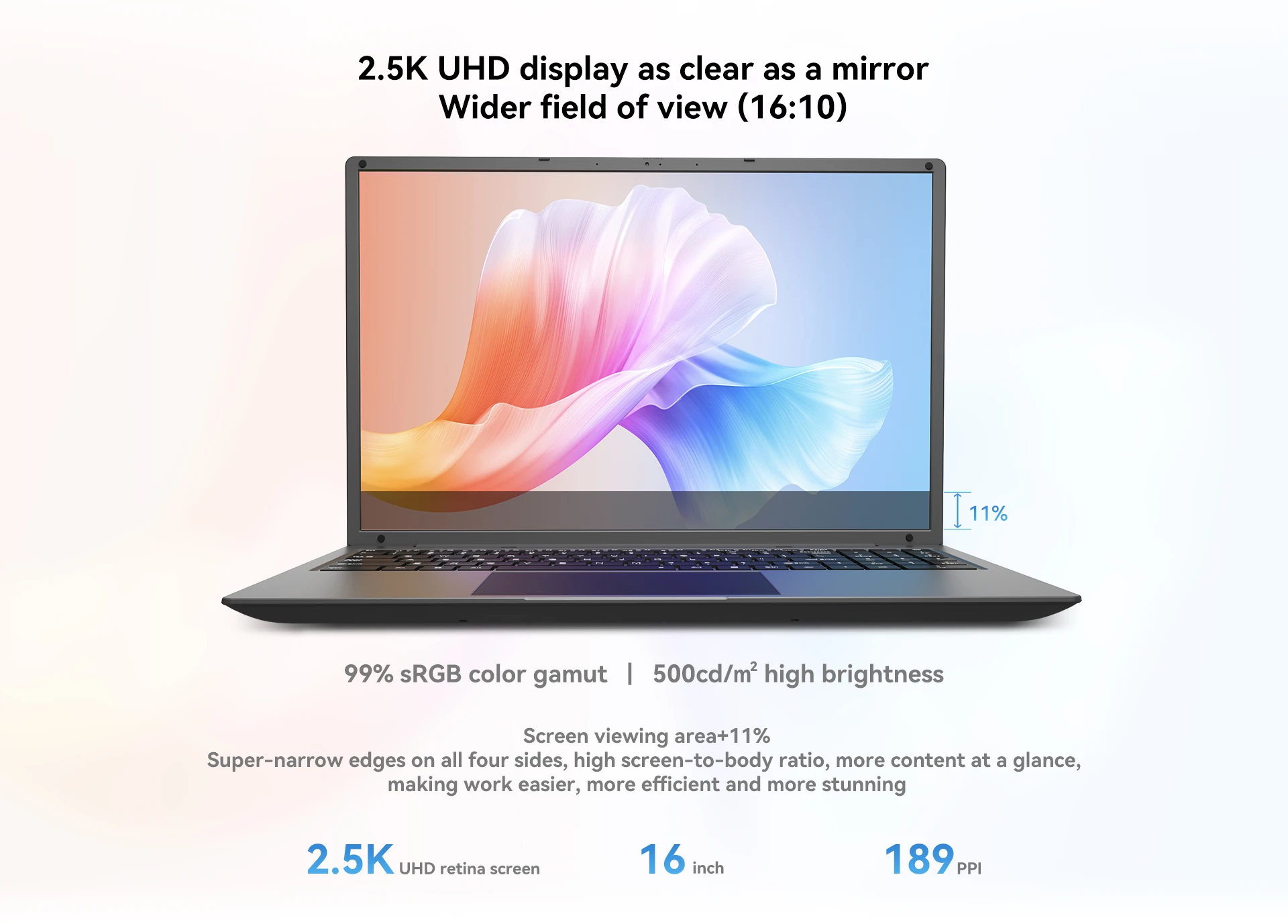 16 inch 2.5K UHD retina screen,189 PPI,99% sRGB color gamut,500cd/㎡ high brightnessMicro-change full screen