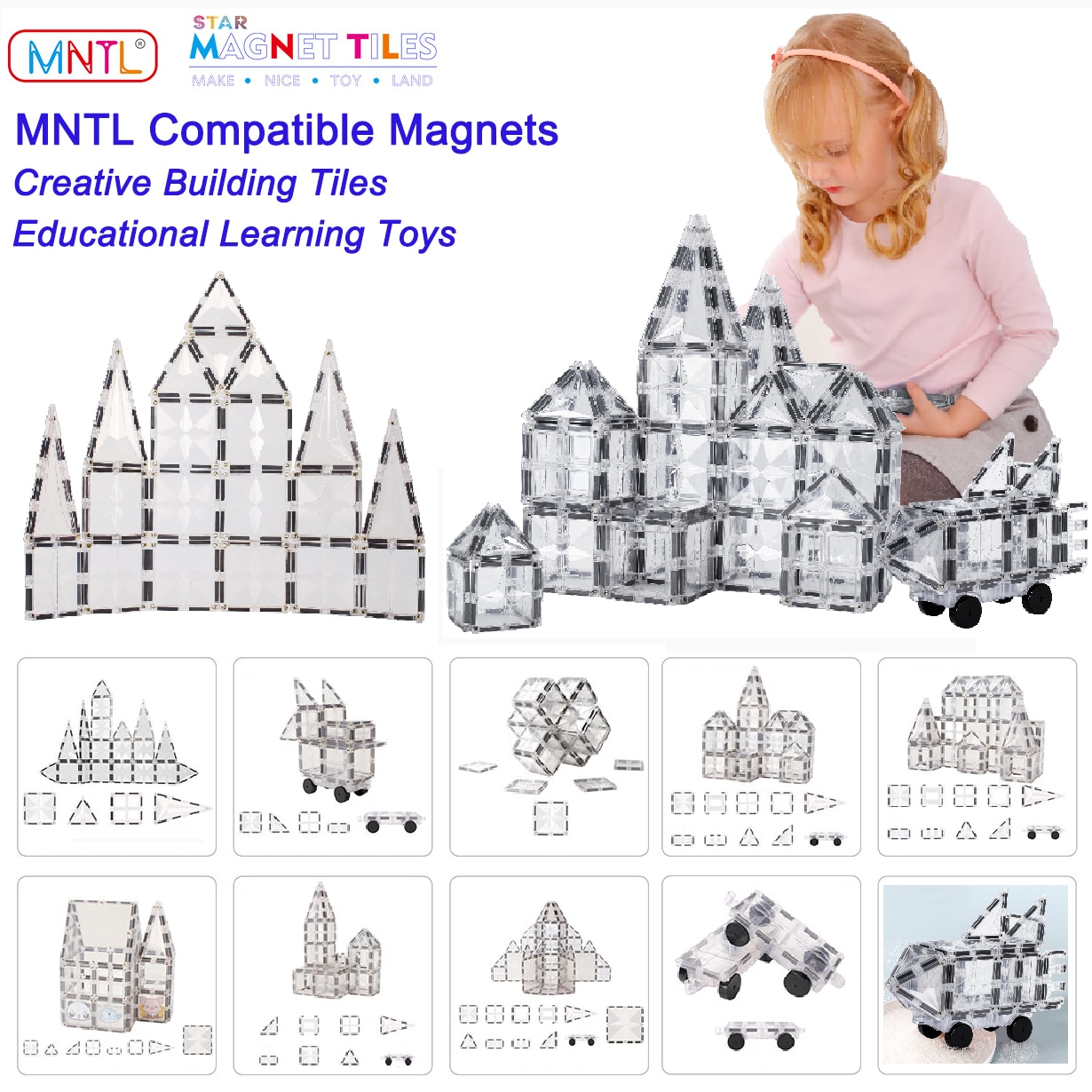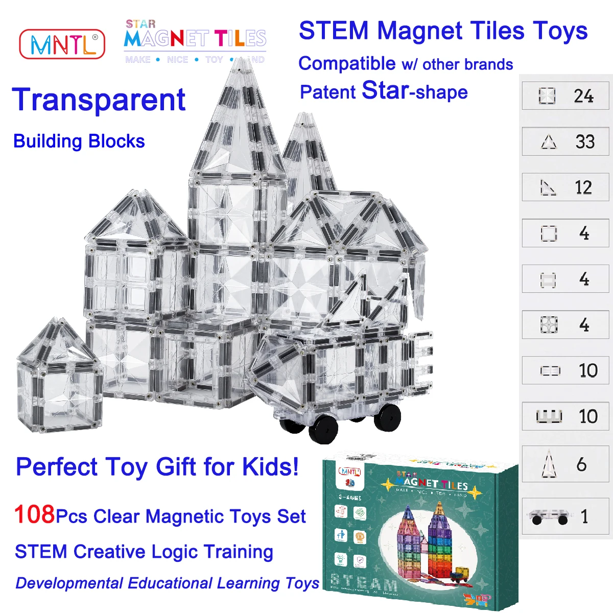 • MNTL Toys Packages: 108Pcs bulk magnetic tiles toys including transparent blocks magnet car